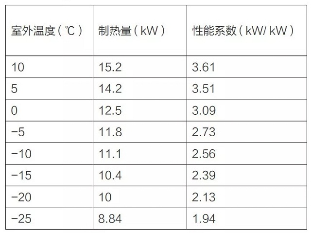 空氣源熱泵機(jī)組做采暖的熱源設(shè)備,與采暖系統(tǒng)的耗電量有關(guān)的主要是制熱量和性能系數(shù)兩個(gè)參數(shù)。我們以一款5HP低溫變頻機(jī)的性能參數(shù)(含水泵)為例來(lái)說(shuō)明,出水溫度按41℃計(jì)算,表2是該機(jī)器的采暖全工況的性能參數(shù)表。