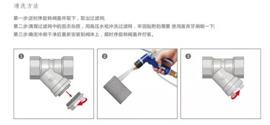 地暖每年在使用前應清洗一次過濾器。具體方法如下:首先關閉連接導管的進、回水閥門,然后打開過濾器、過濾網并清洗干凈,檢查過濾網有無破損及堵塞。如有損壞,應換上同規格的過濾網,按原樣裝好即可。