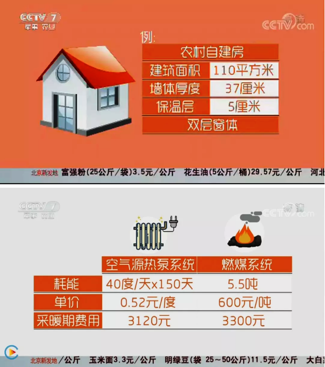 報道指出,以農村自建房為例,建筑面積110平方,墻體厚度37厘米,保溫層5厘米,雙層窗體,按照150天的采暖期,空氣源熱泵系統耗電量為40度/每天,每度為0.52元,采暖期費用為3120元。而燃煤需要5.5噸,以每噸600計算,則需要3300元。