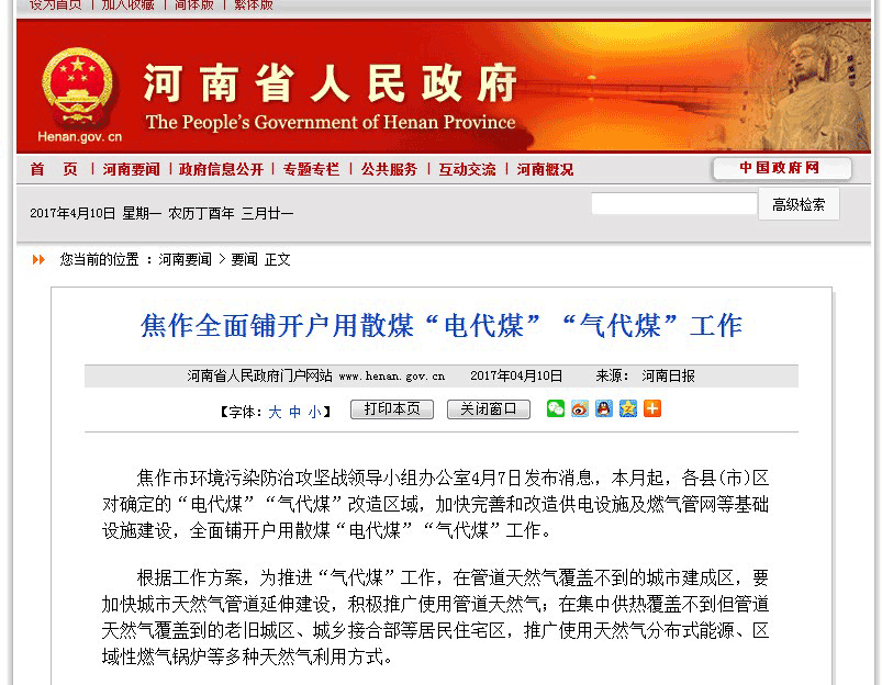 報道中具體談到“(焦作)要求10月底前,市、縣兩級建成區范圍內,嚴禁新建燃煤鍋爐,嚴禁燃煤散燒。在未實現集中供熱的區域應加快集中供熱管網延伸,優先發展集中供熱,其余供熱管網無法覆蓋區域,按照宜氣則氣、宜電則電的原則,完成省下達的“電代煤”“氣代煤”改造民生工程6萬戶任務;在商業和公共領域推廣熱泵采暖100萬平方米以上;1萬戶以上農村居民永久性實現廚炊電氣化!