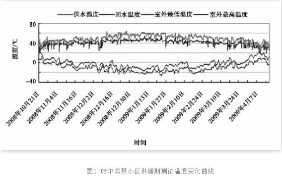 然而,通過對供暖系統(tǒng)的實際運行調(diào)查,目前北方地區(qū)大多數(shù)城市集中供熱系統(tǒng)運行參數(shù),就是在最冷月運行參數(shù)也遠遠小于設(shè)計工況。對北方幾十個城市調(diào)查結(jié)果是:二次網(wǎng)供水溫度約在47℃~63℃,回水溫度約在40℃~50℃,運行溫差約為7.8℃~14.7℃,溫差均小于設(shè)計溫差20℃。圖1是哈爾濱某小區(qū)測試整個供暖季溫度變化曲線,供暖初期供熱溫度低于40℃,最冷天氣供熱溫度為60℃。