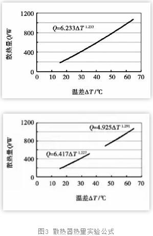 風(fēng)機盤管冷暖兩用,供水溫度可降低,用于住宅供暖時宜立式安裝,宜靠外窗設(shè)置。散熱器用于空氣源熱泵供暖系統(tǒng),熱媒溫度可降低與熱水供應(yīng)溫度55℃一致。其散熱量計算完全可按各類散熱器給出的實驗公式,代入ΔT℃進行計算即可。圖3是對同一組散熱器分別對溫差ΔT=15℃~65℃進行分段實驗和連續(xù)實驗的結(jié)果,低溫工況的散熱量可視為ΔT=40℃~65℃試驗曲線的延長線。