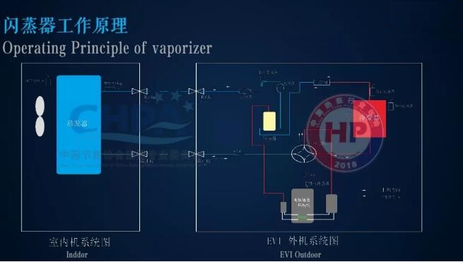 閃蒸器原理則是通過一次節流降壓后,從而導致部分液態制冷劑蒸發,通過制冷劑蒸發后帶走熱量,從而提高剩余液態制冷劑過冷度。蒸發后的制冷劑通過連接管進入壓縮機繼續壓縮,進入循環。同時,板換式經濟器與閃蒸器兩種方式相比,其制熱效果通過實驗對比,能力能效沒有明顯的差異。
