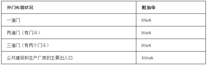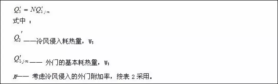 在冬季受風壓和熱壓的作用下,冷空氣由開啟的外門侵入室內。把這部分空氣加熱到室內空氣的溫度所消耗的熱量稱為冷風侵入耗熱量。可按下式計算: