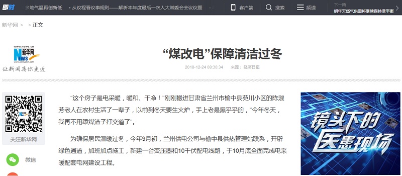 新華網:空氣源熱泵,蓄熱式電鍋爐等“煤改電”設備保障清潔過冬